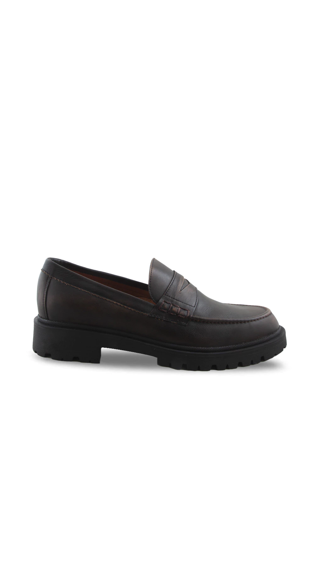 Mocasin con plataforma de goma forrada en cuero vacuno.