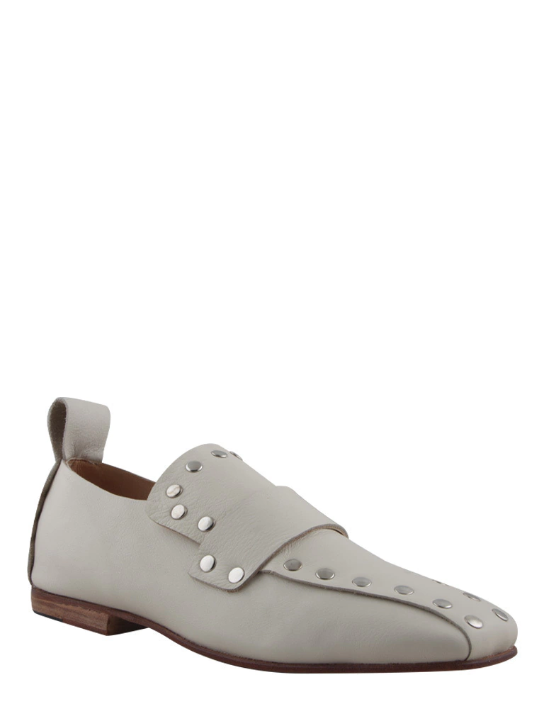 Mocasin de cuero con tachas . Capellada con vincha lisa . Suela de cuero, forrado en cuero Hecho a mano en Argentina.