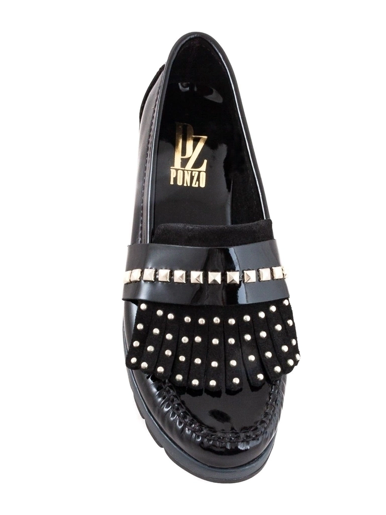 Mocasin de charol con vincha y flecos con tachas.